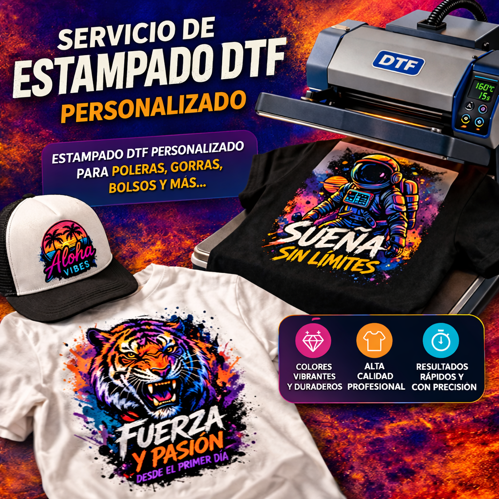 Estampados personalizados con tecnología DTF profesional. Colores intensos, gran definición y alta durabilidad en todo tipo de textiles.